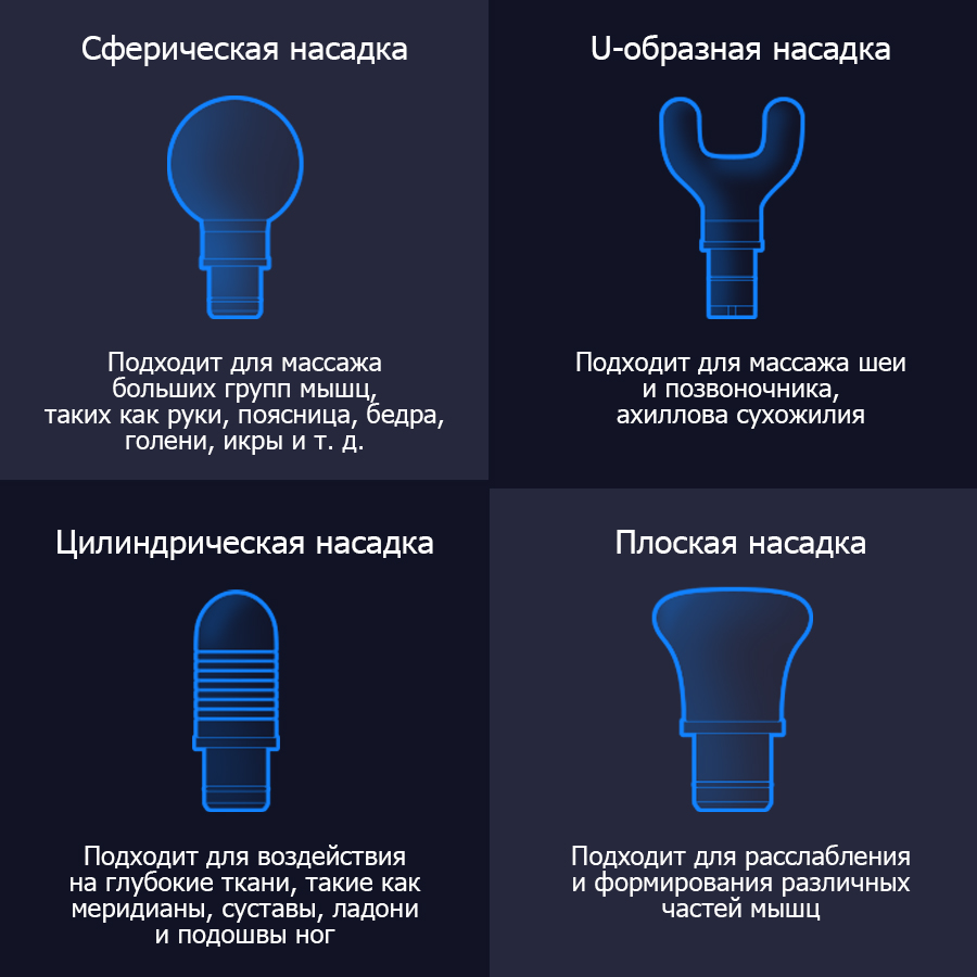 В комплект входят 4 профессиональные массажные насадки для разных групп мышц. Чтобы обеспечить более комфортный массаж, YUNMAI использует мягкий и безвредный для кожи пищевой силикон для массажных насадок. Уникальная сотовая внутренняя структура обеспечивает амортизационную защиту для уменьшения повреждения костей.