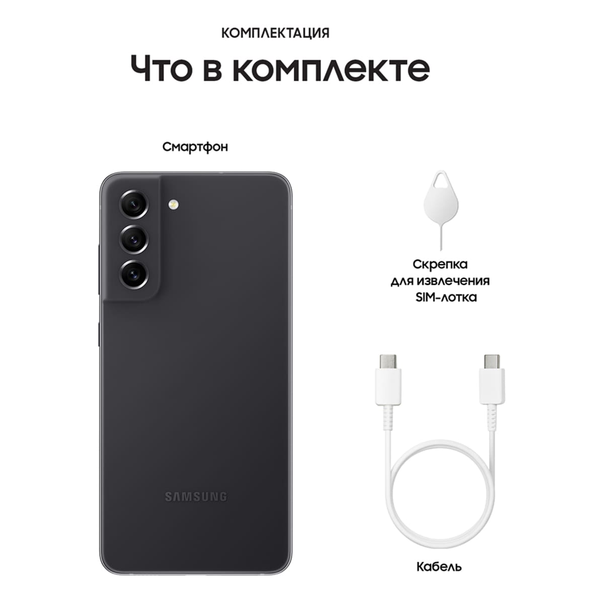смартфон Samsung Galaxy S21 FE, кабель USB Type-C, скрепка для извлечения слота SIM-карты, документация