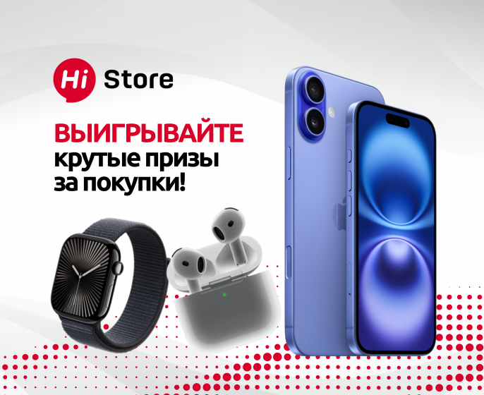 Hi Store дарит своим покупателям уникальный шанс выиграть невероятные подарки! Приходите за покупками в наш магазин, выбирайте технику по душе и участвуйте в розыгрыше. Призов много, и у каждого покупателя есть реальный шанс на победу.